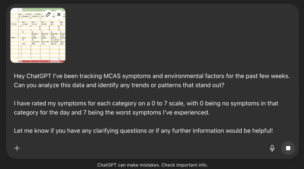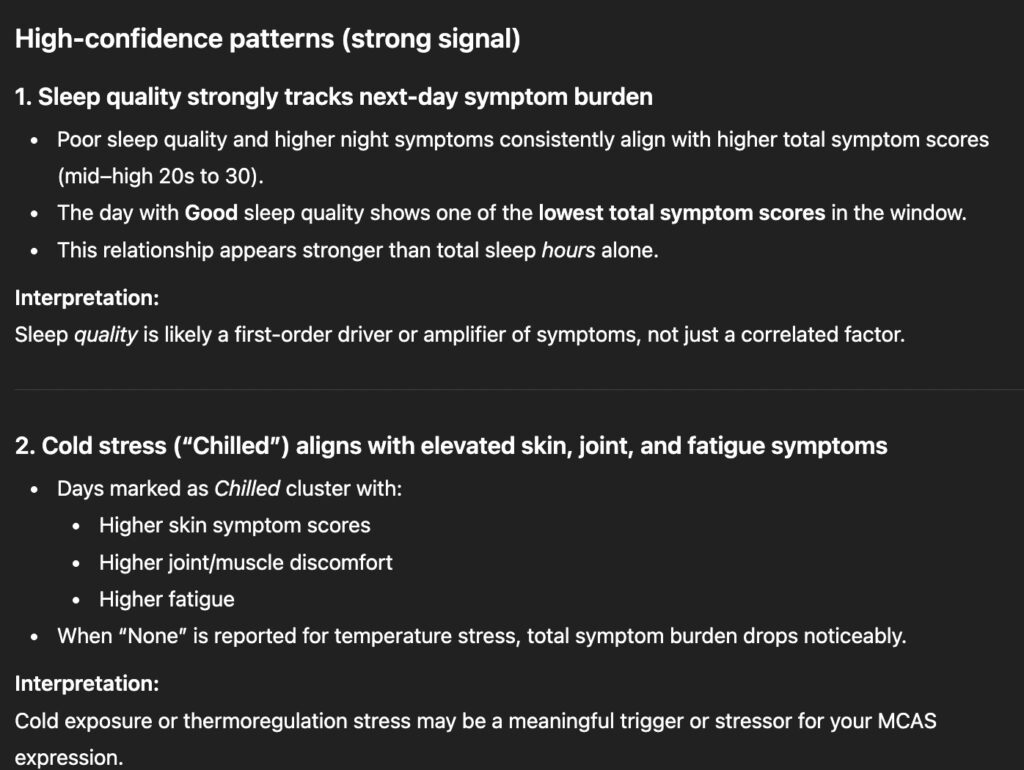 ChatGPT identifying notable trends in my MCAS symptom tracking data