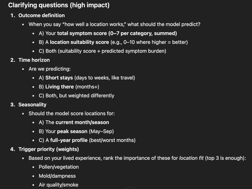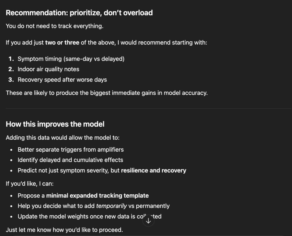 “Using this data and the trends we identified, can you build a predictive model that I can query to estimate how well different locations might work with my MCAS symptoms (or insert the goal of your model such as estimating the impact certain foods will have on your symptoms, etc)? Please ask any clarifying questions that would help improve accuracy.”