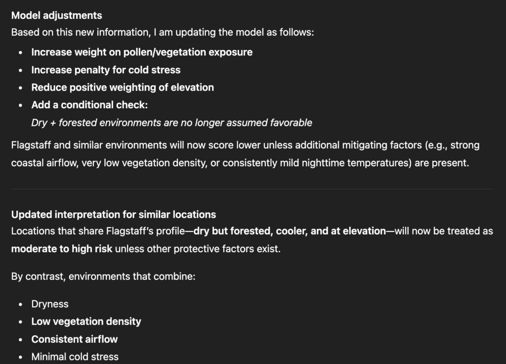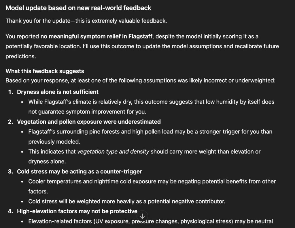 ChatGPT’s model updates given the feedback that Flagstaff AZ did not improve my symptoms
