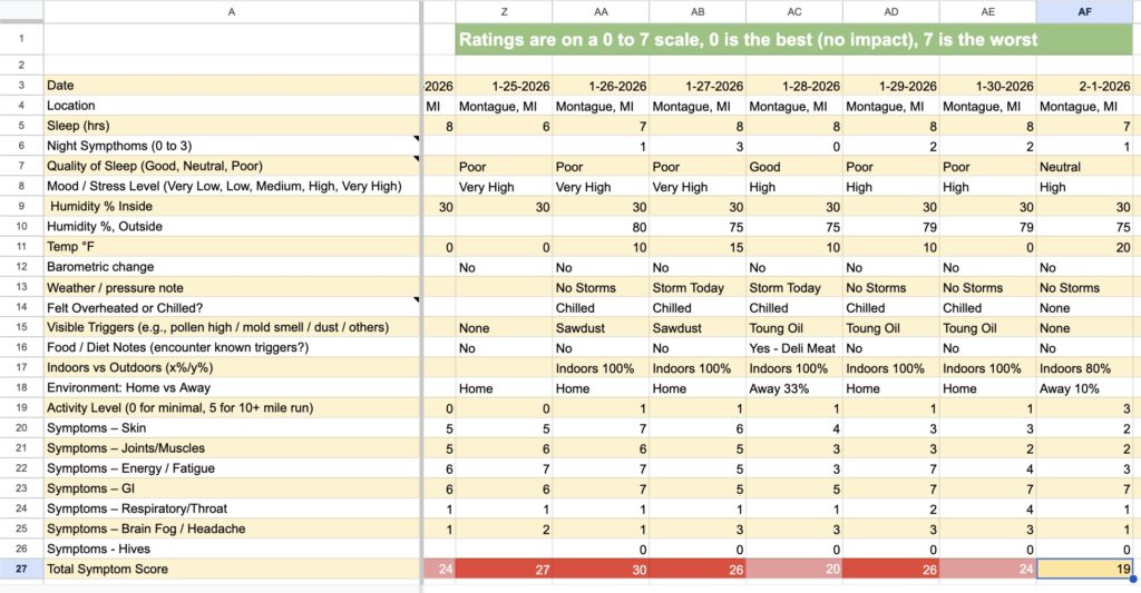 For a concrete example to use in this post, I tracked my daily symptom severity alongside basic environmental factors. This allows a model to explore how my MCAS responds to things like barometric pressure changes, pollen levels, temperature, sleep patterns, and exposure triggers such as dust or mold.